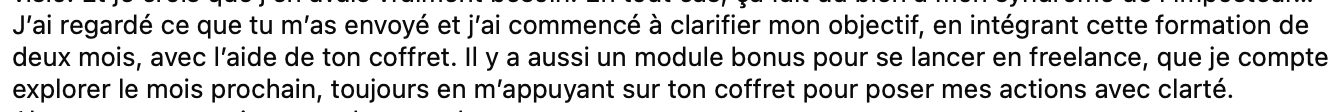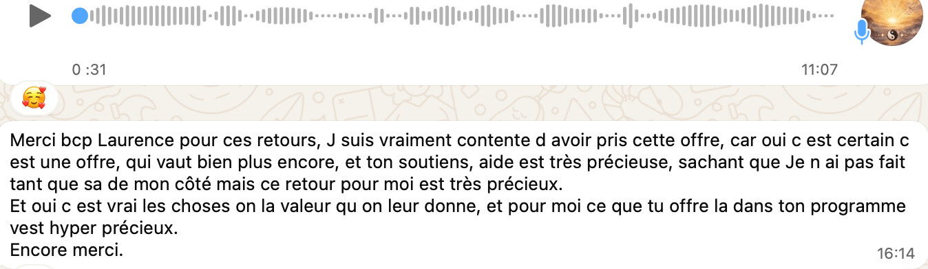 Ce n’est pas un coaching, mais tu as accès au groupe d’entraide WhatsApp pour poser tes questions.